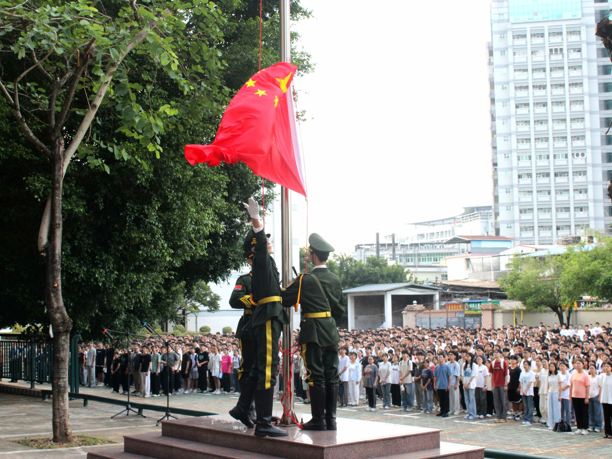 晨光中,国旗护卫队步伐铿锵,护卫五星红旗庄严入场。随着国歌奏响,全体师生肃立行注目礼,齐声高唱,鲜艳夺目的五星红旗冉冉升起,嘹亮的歌声回荡在校园上空。