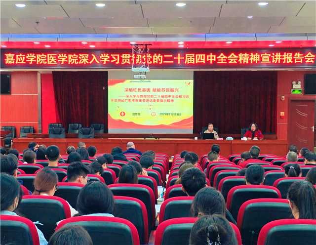 为深入学习贯彻党的二十届四中全会精神,扎实开展全会精神宣讲行动,根据学校有关通知精神,11月19日下午,我院召开深入学习贯彻党的二十届四中全会精神宣讲报告会。学院党政领导班子成员,各科室、系负责同志,全体教工党员,在校学生党员、近期发展对象、入党积极分子约320人参加,会议由学院党委书记钟珊主持。