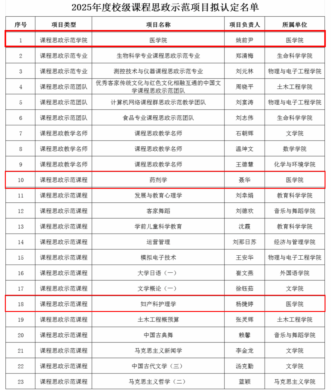近日,嘉应学院2025年度课程思政示范项目立项结果正式公布。此次遴选是学校落实教育部《高等学校课程思政建设指导纲要》等文件精神、推进课程思政建设提升计划的重要举措。我院凭借鲜明的建设特色、扎实的工作基础和显著的育人成效,在激烈角逐中脱颖而出,成为本年度唯一获批的课程思政示范学院,同时《药剂学》与《妇产科护理学》两门课程获评课程思政示范课程,实现学院与课程层面建设双丰收,与学校聚焦内涵提质、厚植客家红韵育人底色的核心发展方向高度契合,为学校相关战略的落地实施筑牢坚实实践根基。