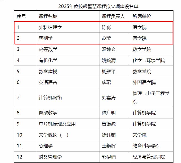近日,学校首批智慧课程建设项目立项结果正式公布,共立项建设20门智慧课程,我院《外科护理学》《药剂学》两门课程凭借鲜明的建设特色、扎实的改革基础成功获批,标志着我院在课程数字化升级、教学范式创新及信息技术与教育教学深度融合方面迈出关键一步,为人才培养高质量发展注入新活力。