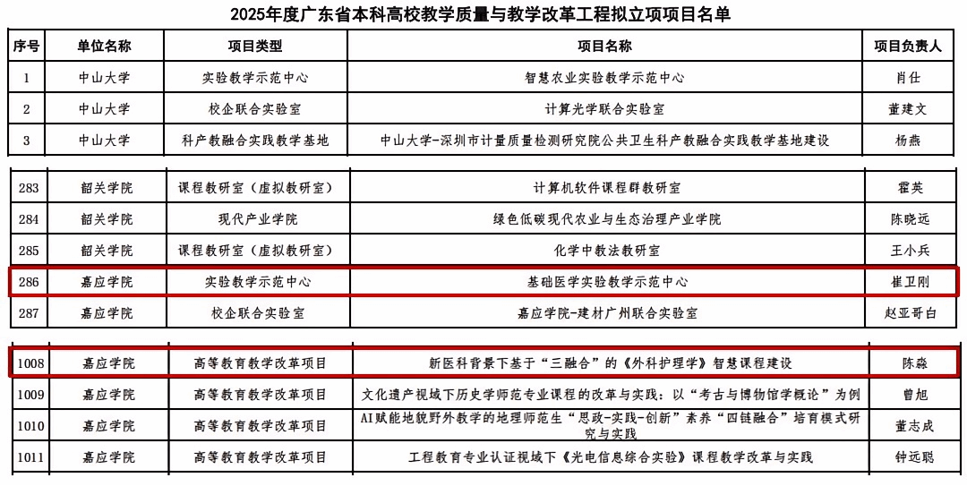近日,2025 年度广东省本科高校教学质量与教学改革工程建设项目立项结果公布,我院《基础医学实验教学示范中心》成功获批实验教学示范中心项目,《新医科背景下基于“三融合”的外科护理学智慧课程建设》顺利立项高等教育教学改革项目。双项成果落地,彰显学院在教学质量提升、改革创新领域的扎实成效。