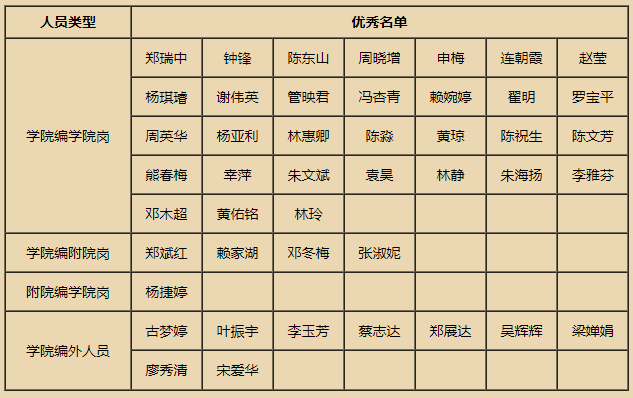 按照《广东省事业单位工作人员考核办法(试行)》(粤人社发〔2011〕125号)文件精神,依据《嘉应学院医学院教职工年度考核办法(试行)》,经学院研究决定,推荐下列45位同志为2021学年度考核优秀,现予公示。公示时间从2021年12月23日至2021年12月29日止。若对下列同志有异议,请电话或书面向学院人事科反映。反映情况要自报或签署真实姓名,要有具体事实;不报或不签署真实姓名的,不提供具体事实材料的,一律不予受理。