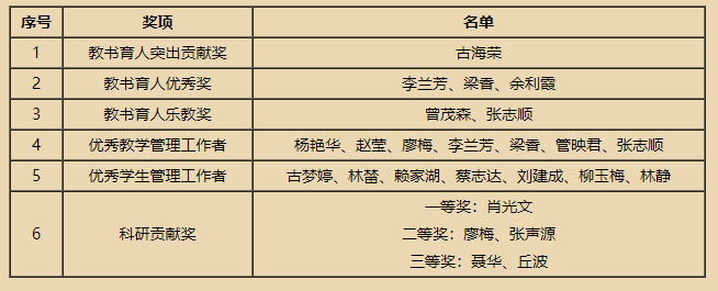根据《 关于做好2020-2021学年度“邓振龙教书育人突出贡献奖”“邓振龙教书育人优秀奖”评选工作的通知》(嘉院医函〔2021〕7号)等通知要求,通过自下而上逐级推荐、评审,经研究,现将我院2020-2021年度符合“教书育人突出贡献奖”“教书育人优秀奖”“教书育人乐教奖”“优秀教学管理工作者”“优秀学生管理工作者”“科研贡献奖”的人员予以公示(名单见附件)。