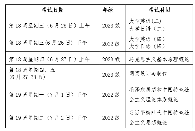 第19周星期一至第20周星期四(7月1日至7月11日)为专业基础课程、专业课程考试时间,各课程具体考试时间、地点及监考教师另行通知。