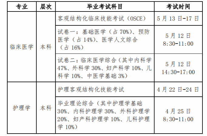 注:①药学、医学检验技术本科专业不安排毕业理论考试。