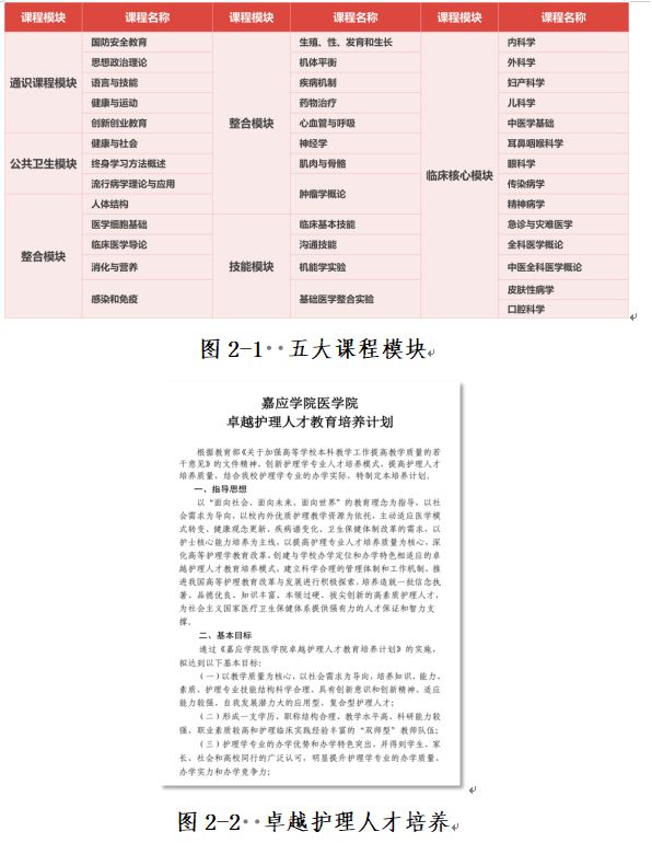 对标《中国本科医学教育标准》,临床医学本科专业实施整合模块新医学教学模式,设置五大课程模块,构建符合预防治疗、康养的生命健康全周期医学的新医科理念课程体系,培养健康中国建设、保障人民健康的应用型医学人才。护理学专业实施“卓越护理人才培养”。