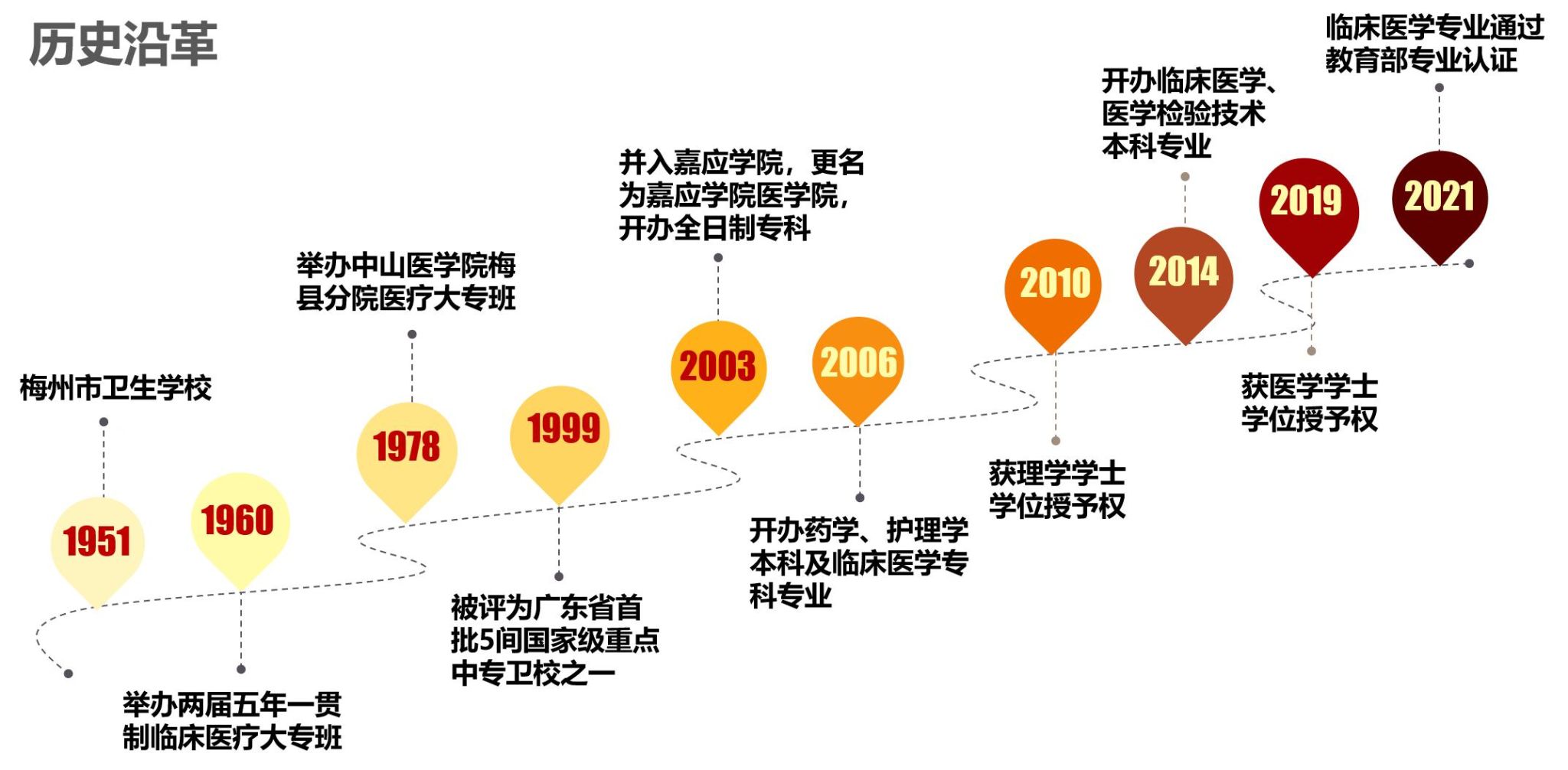 嘉应学院医学院前身为创办于1951年3月的广东省梅州市卫生学校,2003年4月经广东省人民政府批准升格,并入嘉应学院成为嘉应学院二级学院。学院开设有临床医学、药学、护理学、医学检验技术4个本科专业和临床医学专科专业。在校全日制学生4460人。专任教师223人,其中副高职称以上教师77人,博士学位教师31人,聘请有廖万清院士等客座教授20人。有50多名教师担任国家级及省市级学会副理事长、理事等学术职务。