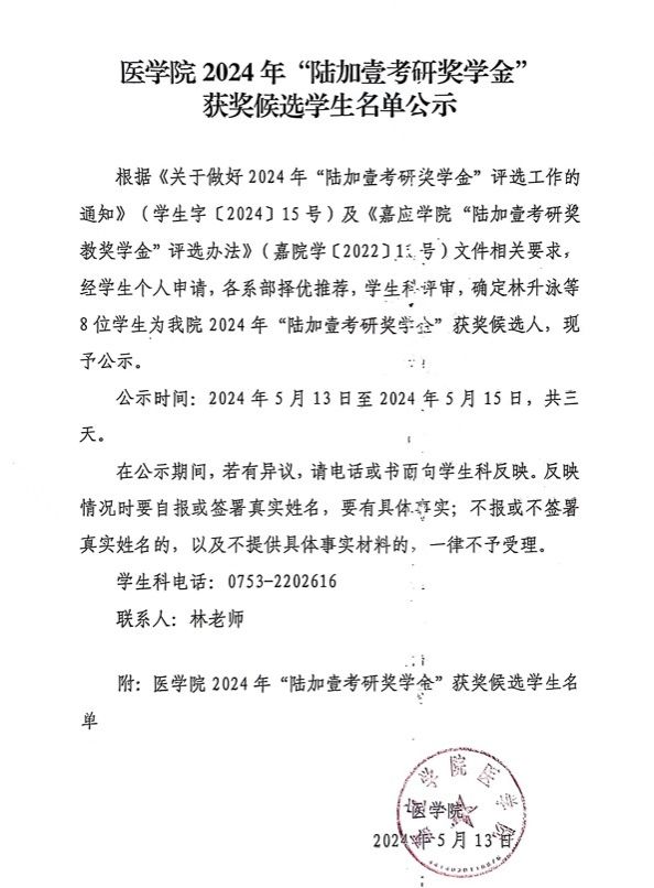 医学院2024年“陆加壹考研奖学金”候选学生名单公示