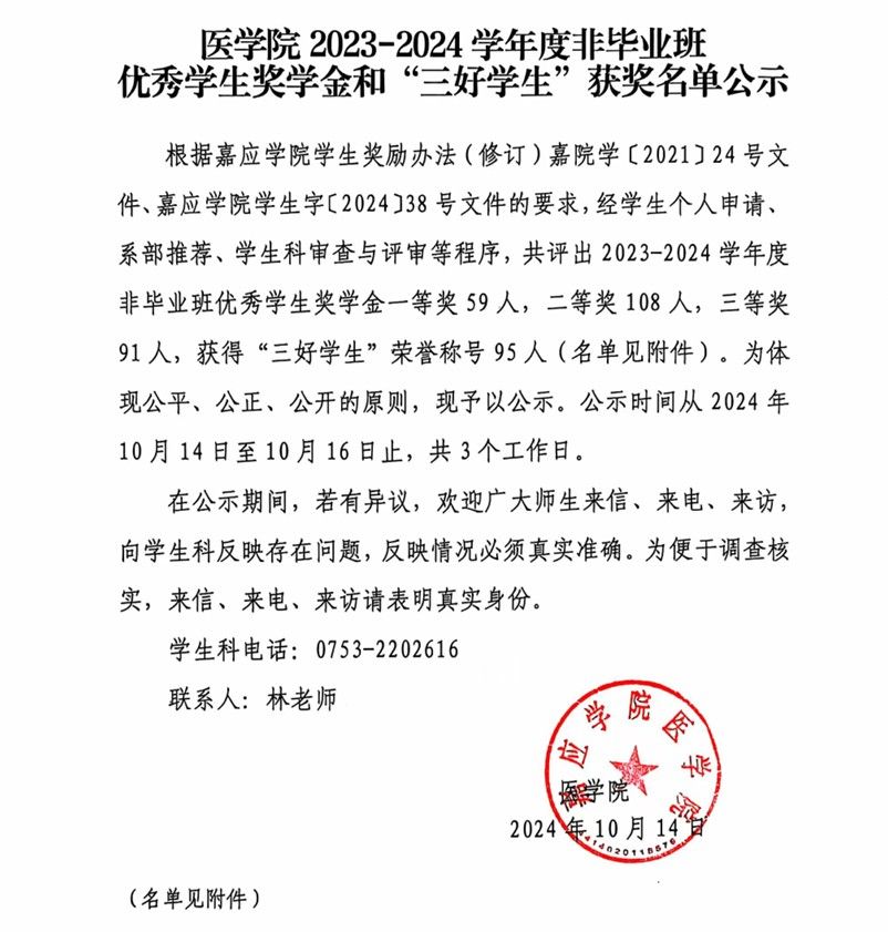 医学院2023-2024学年度非毕业班优秀学生奖学金和“三好学生”获奖名单公示